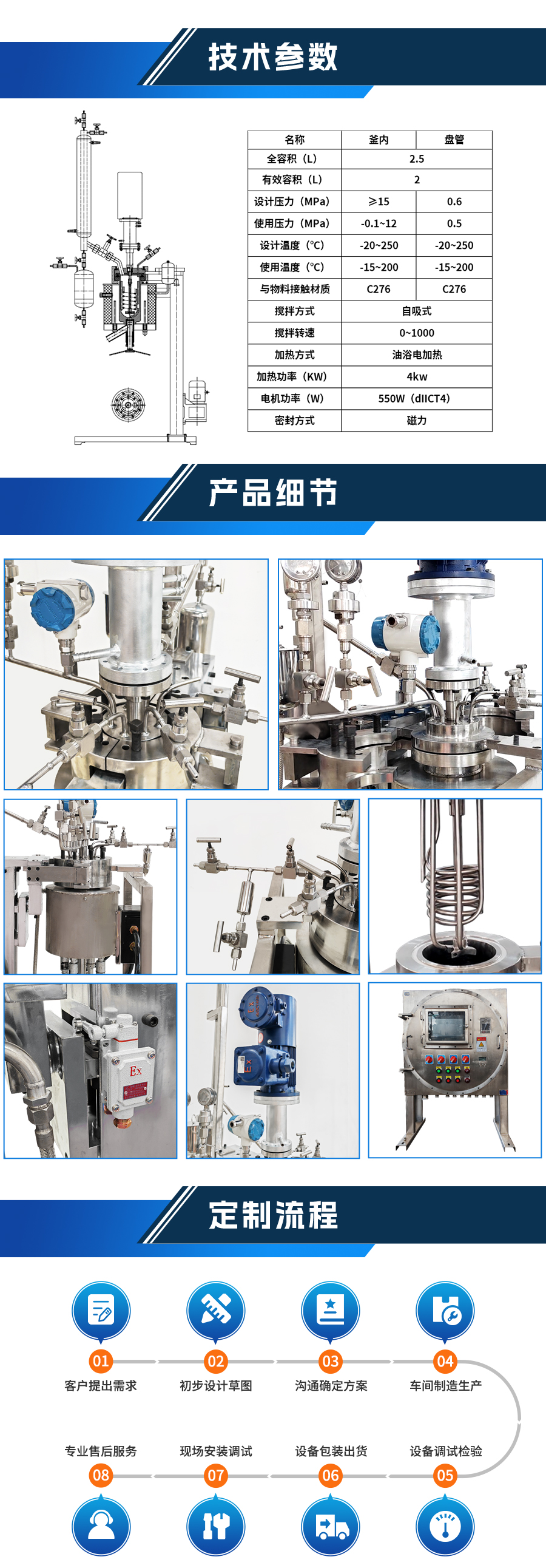 如果用戶在釜蓋、釜體開口、內部結構、壓力高低、攪拌槳葉、及增加其他輔助裝置(如冷凝回流裝置、冷凝器、恒壓加料罐、接收裝置)等有特殊要求,可完全按用戶的要求加工制造